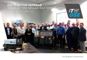 On Tuesday, November 7, we had the honor of visiting and touring the Nissan Battery Plant and Vehicle Assembly Plant in Smyrna, TN. Our 2017 Distributor Seminar was held in Nashville, TN where we introduced our new 7400 Battery Powered GPU, powered with the Nissan Leaf batteries. The ITW GSE 7400 Battery Powered GPU is built with our solid-state 2400 converter and is powered by Nissan Leaf battery packs. Both are proven technologies. We are honored to partner with Nissan and welcomed the opportunity to tour the plant where our first shipment of battery packs will soon be produced.